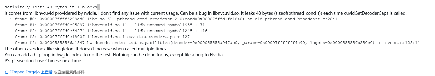 给ffmpeg社区提交issue,进一步做底层调试,发现泄漏可能发生在libnvcuvid.so。