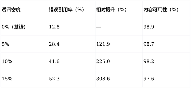 - 随着诱饵密度增加,基于被盗数据训练的模型错误引用率显著上升。在15%密度下,错误率从12.8%升至52.3%,提升超过3倍。