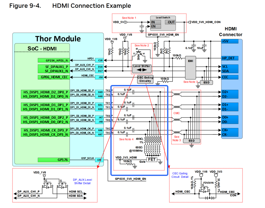 Jetson thor design guideline中提到,HDMI信号线需要加499ohm下拉、磁珠和MOS FET,但是参考设计原理图中,27页HDMI接口没有这部分电路。 请问是否需要这部分电路?