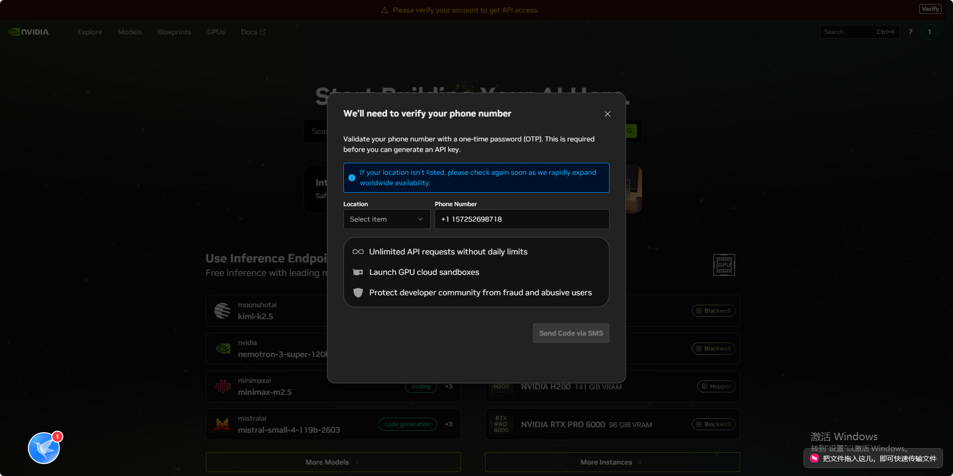 管理员您好, 我在尝试为NVIDIA NIM生成API Key时,遇到了手机号验证问题。我使用的是中国大陆+86手机号,但验证页面无法选择+86以外的区号